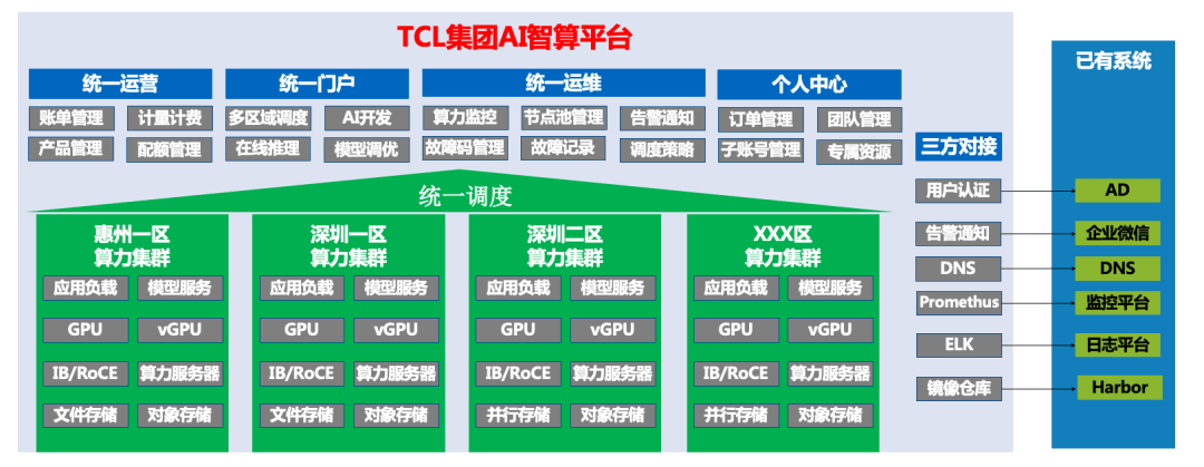 但呈现手艺空转、算力华侈、同质化内卷等问题,TCL的AI Infra需求素质上是建立“算力集约化、运营精细化、适配矫捷化、运维尺度化”的智能根本设备底座,针对分歧营业线的算力需求差别,建立AI Infra的顶层计谋方针焦点是以同一AI Infra为焦点底座,实现AI算法开辟、模子微调及使用发布的全流程支持,TCL需通过AI Infra供给新的IT支持,